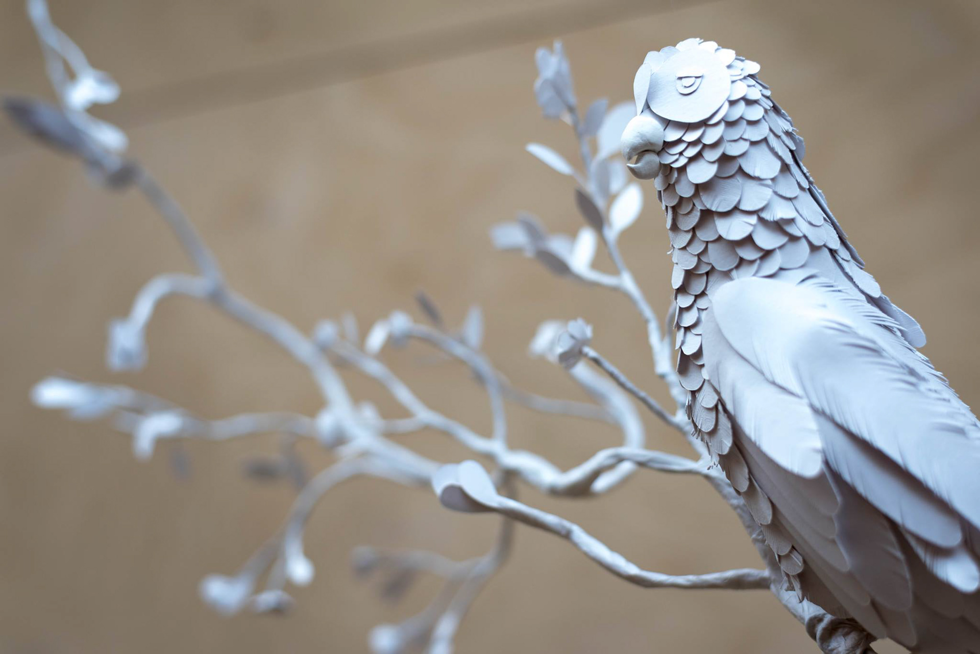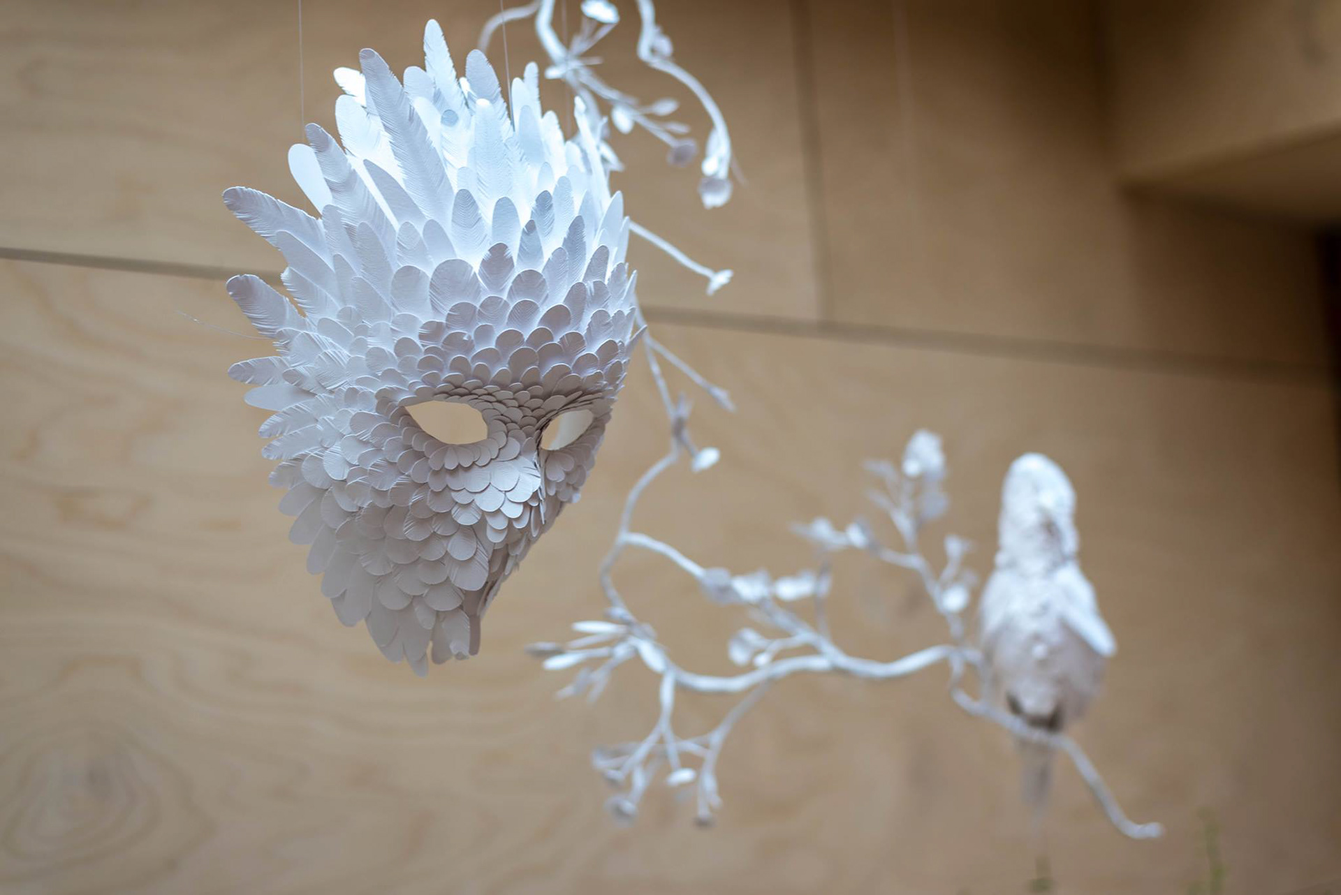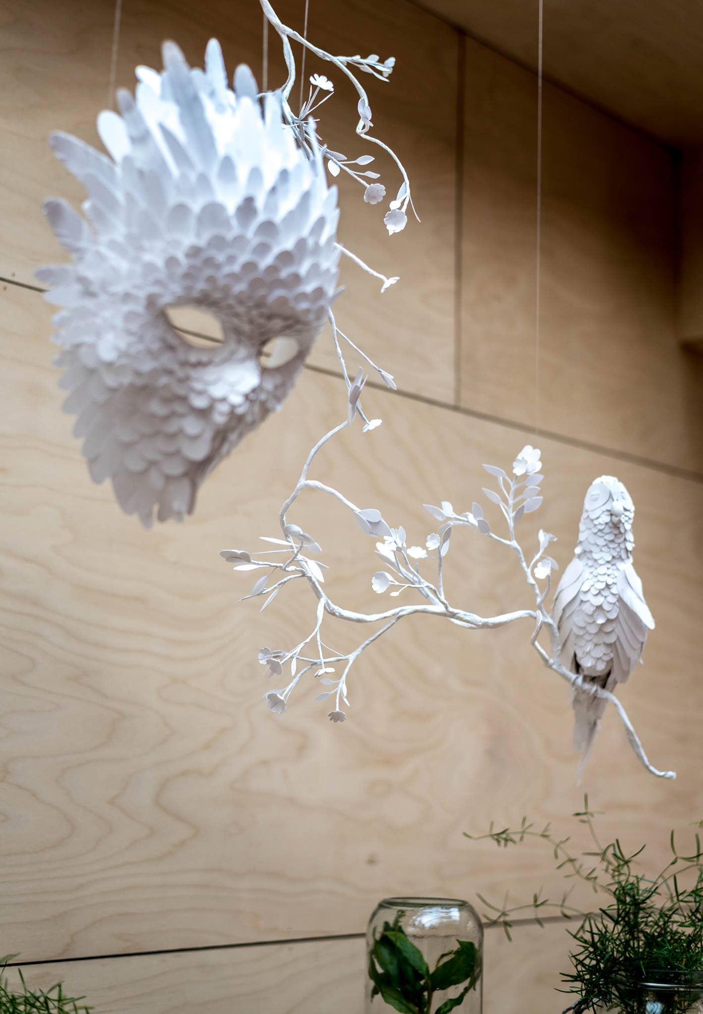 Presented in the cosy and warm wooden room by ECO SPACE, a feather mask, two birds and branches of paper float in the air like a dream awake. All feathers and flowers are cut and assembled by hand.